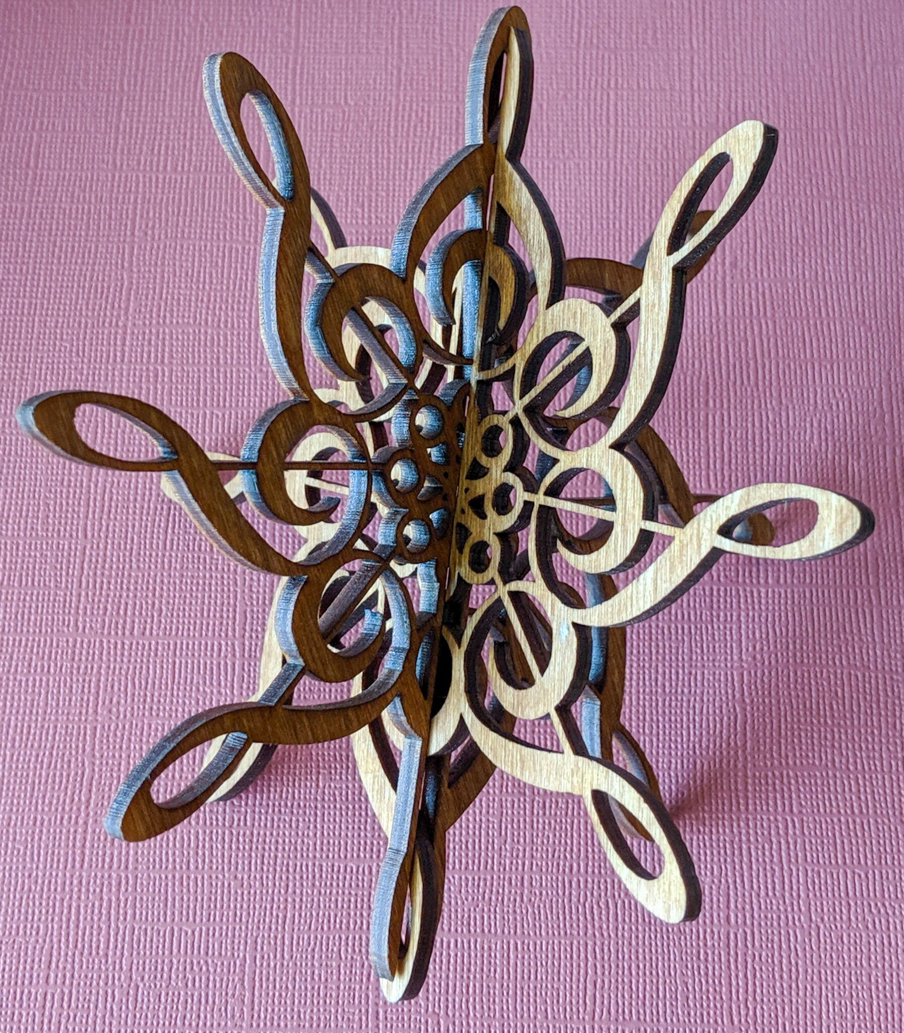 This laser cut Christmas ornament uses 2 treble clef ornaments to form a 3D snowflake. These ornaments ship in pairs and must be glued in the middle with elmer's glue, wood glue, etc.