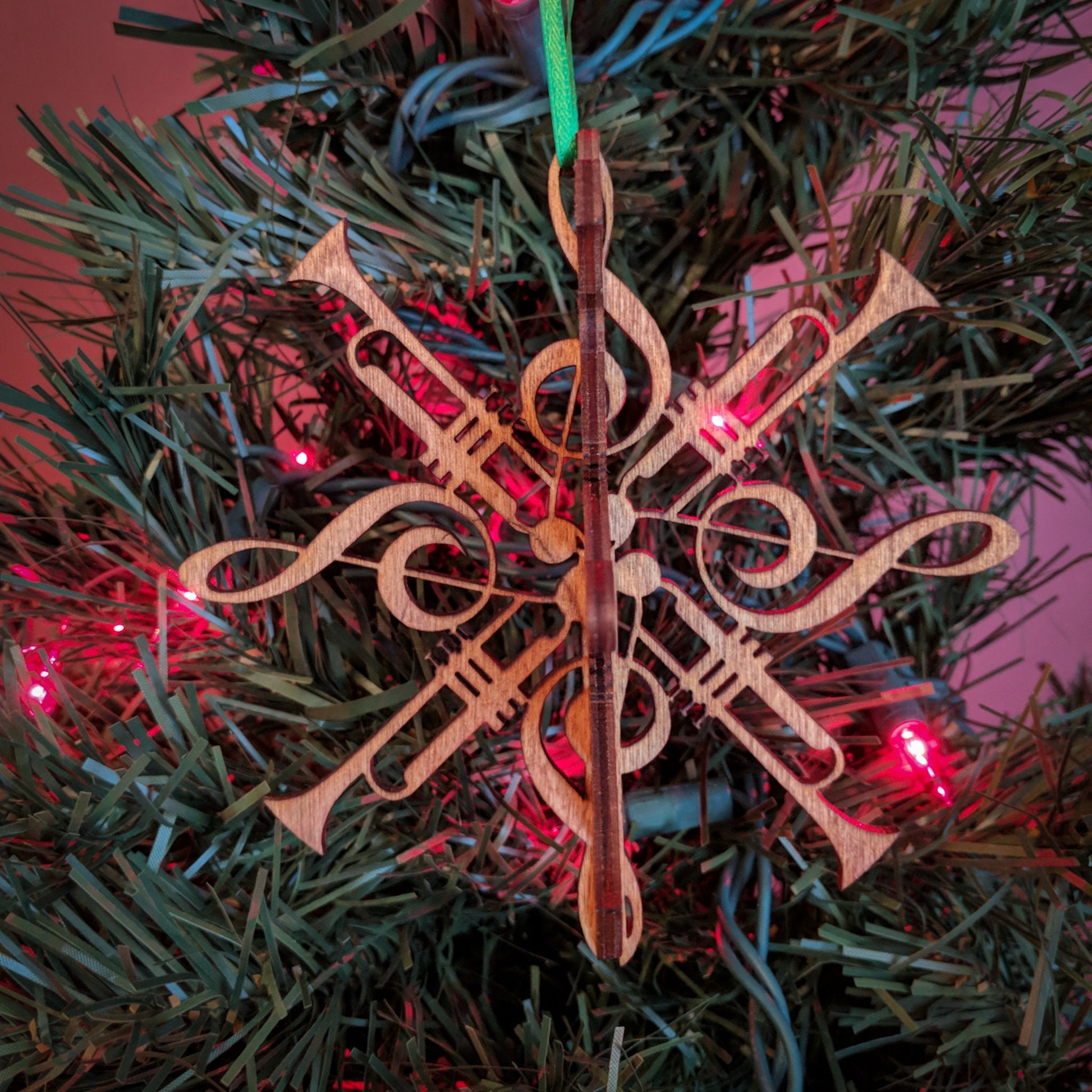 This laser cut Christmas ornament uses 2 trumpet and treble clef ornaments. These ornaments ship in pairs and must be glued in the middle with elmer's glue, wood glue, etc. This is a great gift for those that play instruments or love music.