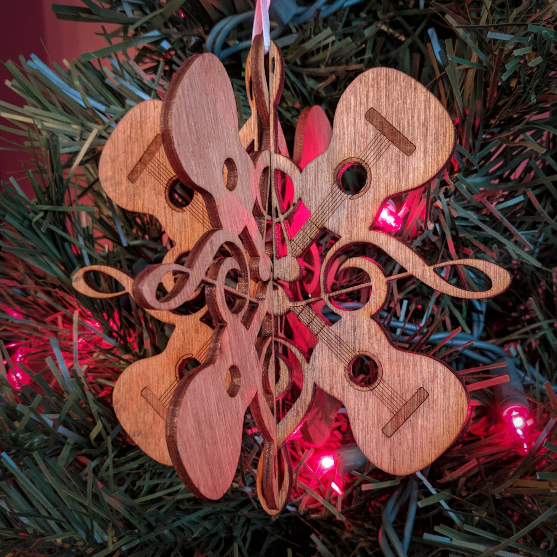 It's made of Baltic birch and is laser cut and engraved. Engraved instrument details on four sides of the ornament as seen in video (on one of the two ornaments that slide together). The birch plywood is 1/8" thick. It comes on a ribbon usually white, red, or green. It's stained and sure to last a lifetime.