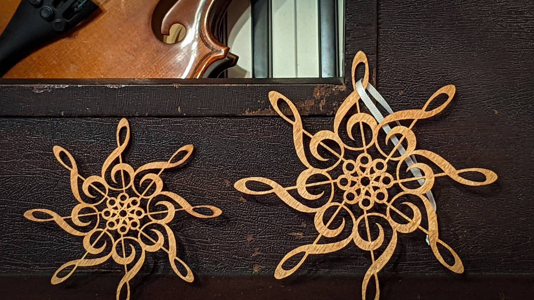 It's made of Baltic birch and is laser cut and engraved. The birch plywood is 1/8" thick. It comes on a ribbon usually white, red, or green. It's stained and sure to last a lifetime.
